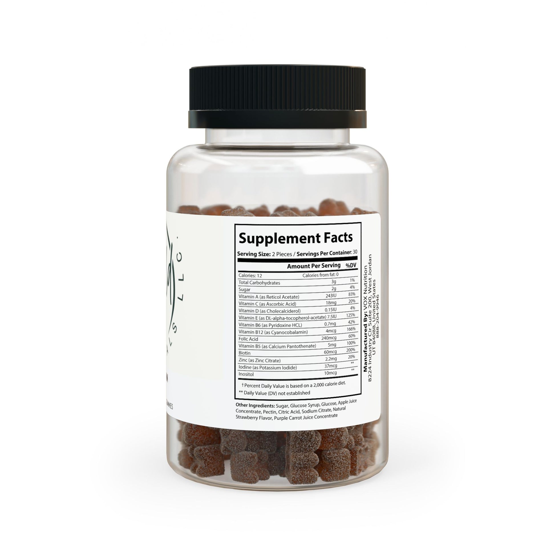 Ingredients: Vitamin A (as Reticol Acetate), Vitamin C (as Ascorbic Acid), Vitamin D (as Cholecalciderol), Vitamin E (as DL-alpha-tocopherol-acetate), Vitamin B6 (as Pyridoxine HCL), Vitamin B12 (as Cyanocobalamin), Folic Acid, Vitamin B5 (as Calcium Pantothenate), Biotin, Zinc (as Zinc Citrate), Iodine (as Potassium Iodide), Inositol. Other Ingredients: Sugar, Glucose Syrup, Glucose, Apple Juice Concentrate, Pectin, Citric Acid, Sodium Citrate, Natural Strawberry Flavor, Purple Carrot Juice Concentrate